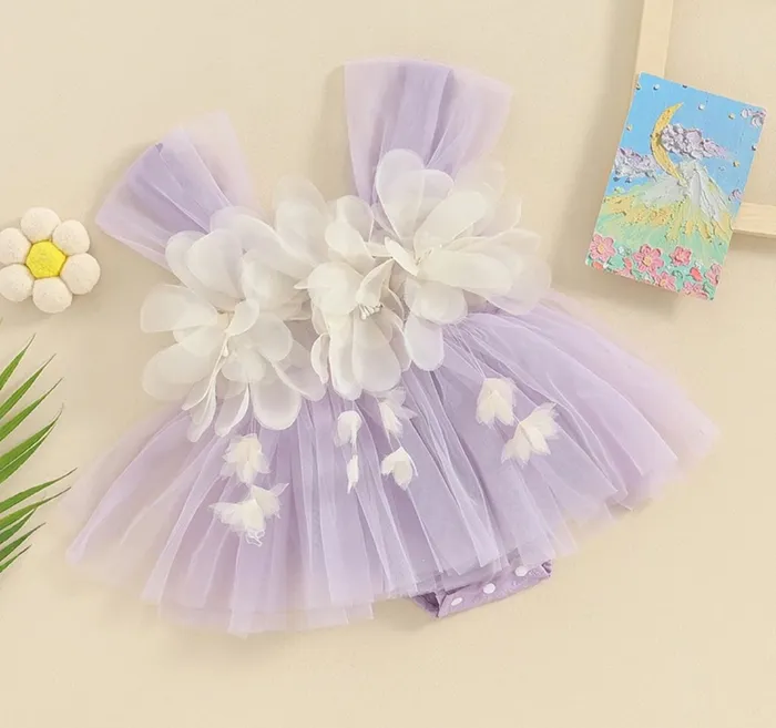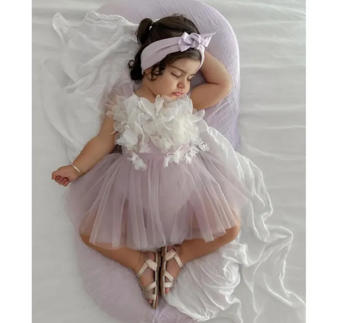 فستان باللون البنفسي الناعم مع تنسيق ورود باللون الابيض