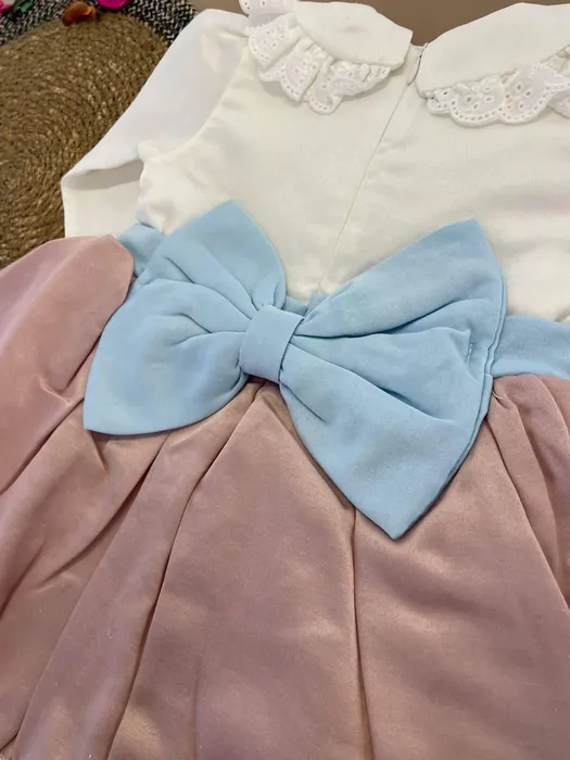 فستان بلون الزهر المعتق والابيض والازرق وببيونه في الخلف